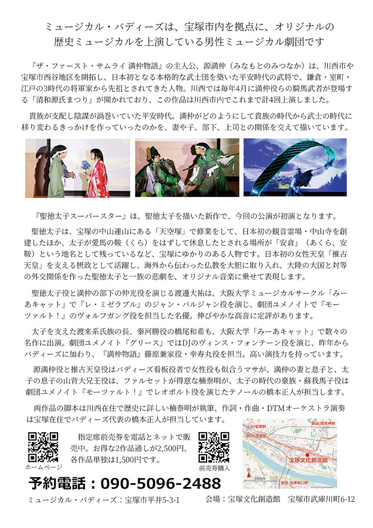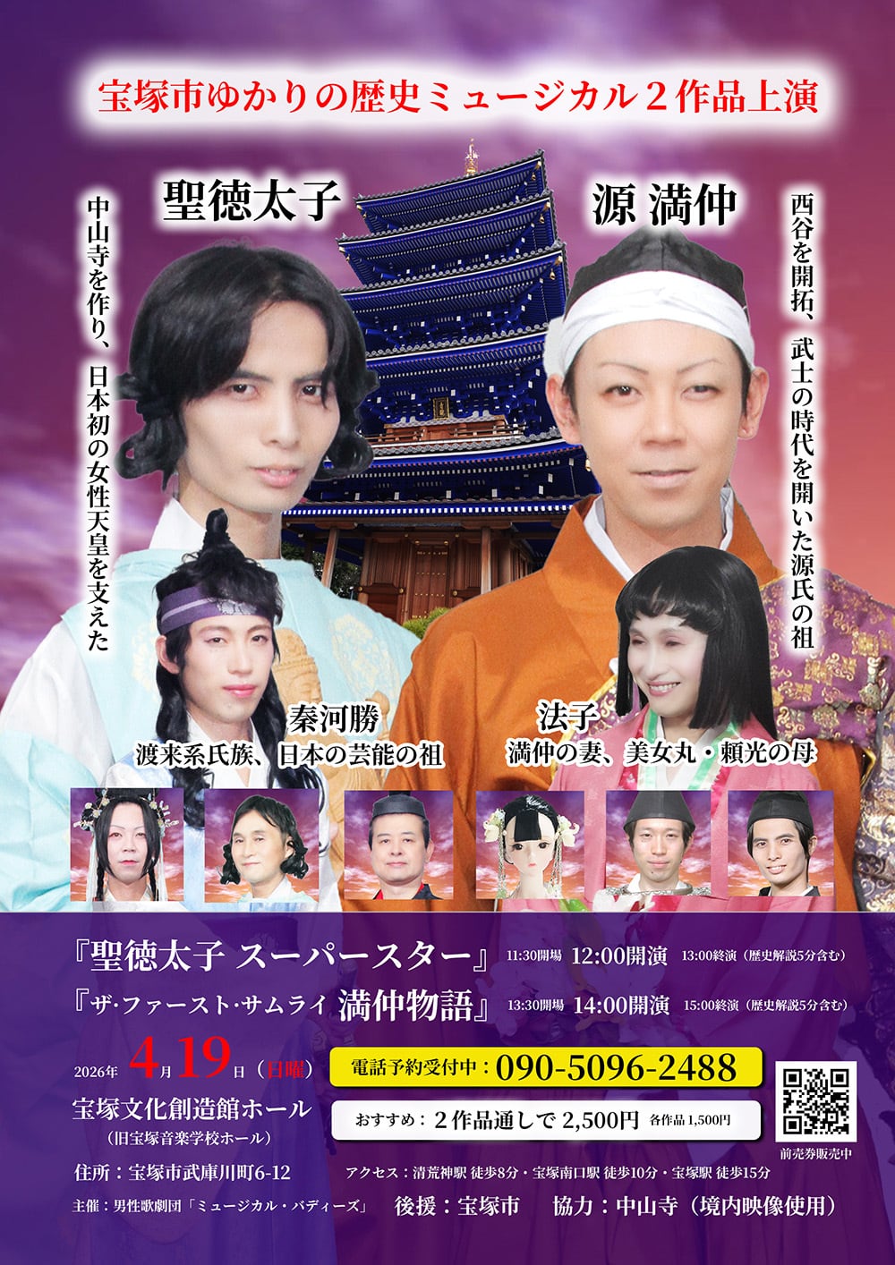 2026年(令和8年)4月19日(日)午後2時から兵庫県宝塚市内の宝塚文化創造館(旧宝塚音楽学校)ホールで上演する、平安時代ミュージカル『ザ・ファーストサムライ 満仲物語』の前売券です。